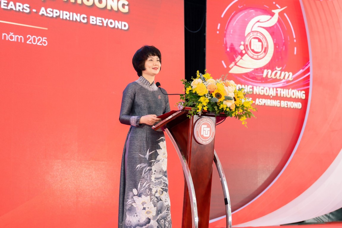 Trình bày diễn văn khai mạc, PGS, TS Phạm Thu Hương - Bí thư Đảng ủy, Hiệu trưởng nhà trường chia sẻ: “Trải qua 65 năm xây dựng và phát triển, Trường Đại học Ngoại thương tự hào là cơ sở giáo dục đại học có uy tín hàng đầu ở Việt Nam về chất lượng tuyển sinh đầu vào; về hệ sinh thái giáo dục quốc tế mở, năng động và sáng tạo.